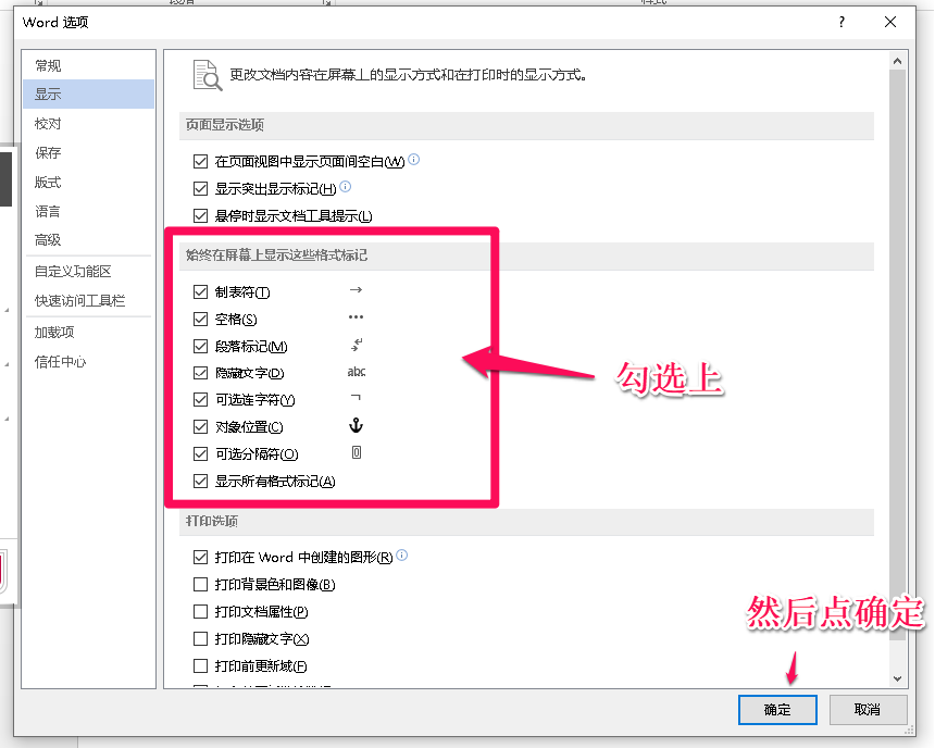 找到“文件” -> “选项” -> “显示”,勾选上这些辅助的格式标记