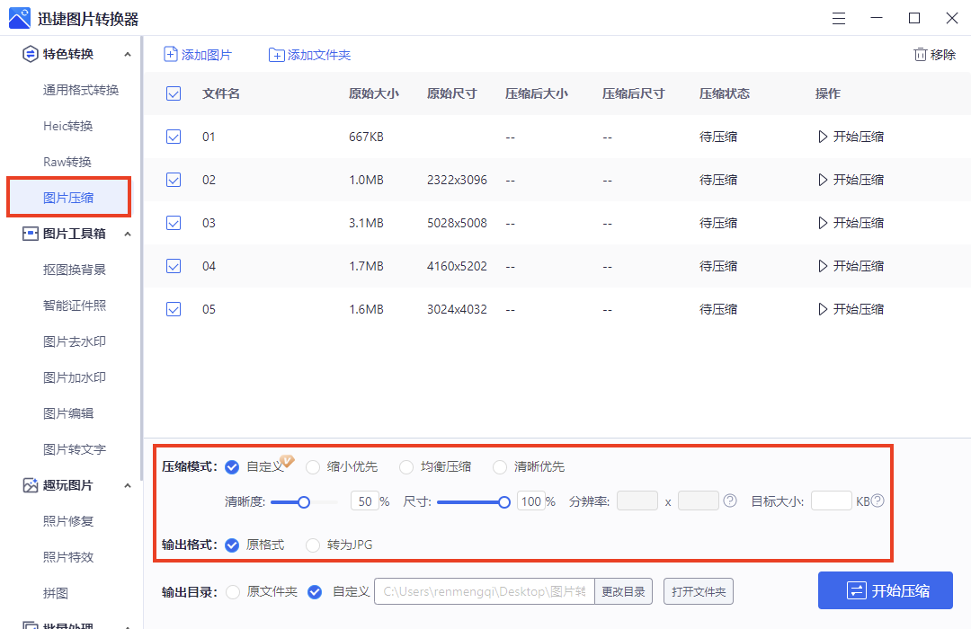 当图片体积太大,还可以进行批量「图片压缩」,添加图片后设置压缩模式、清晰度、分辨率、输出格式,以及压缩后的图片大小。