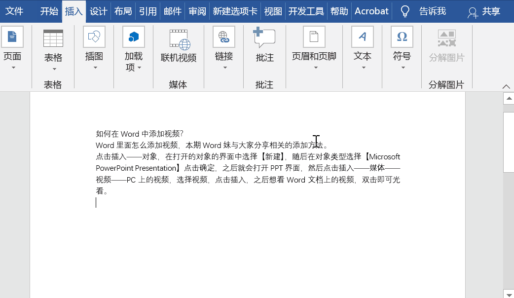 点击插入——对象,在打开的对象的界面中选择【新建】,随后在对象类型选择【MicrosoftPowerPoint Presentation】点击确定,之后就会打开PPT界面,然后点击插入——媒体——视频——PC上的视频,选择视频点击插入,之后想看Word文档上的视频,双击即可观看。