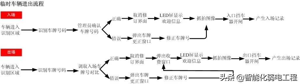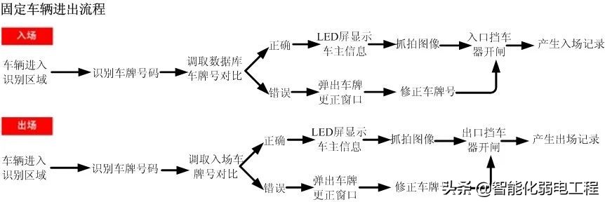 车辆开至入口地感区域,地感信号触发爆闪灯闪烁及网络摄像机工作,摄像机识别车牌号码后,会在数据库里搜索是否有该入场时识别的车牌号码并对比,若对比正确,图像对比系统启动,摄像机在0.2秒内会自动抓拍车辆出场图片,并调出该车入场图片对比后一起保存,出口挡车器打开。若对比错误,软件会弹出一个车牌修正窗口,修正好车牌后,再开闸放行,同时图像对比系统启动,摄像机在0.2秒内会自动抓拍车辆出场图片,并调出该车入场图片对比后一起保存,出口挡车器打开。车过后,闸杆自动落下,车辆通行离开停车场。