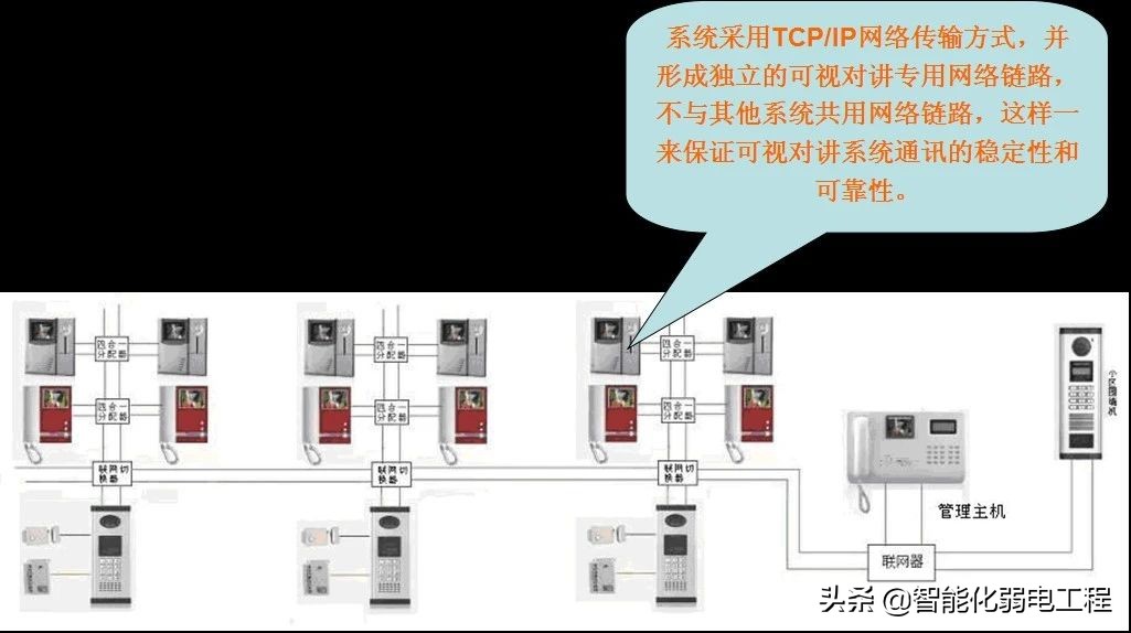 系统采用智能型可视对讲防盗系统,在小区主入口以及18栋楼门口岗亭各设置一台围墙机,为住宅区单元一层出入口及地下室前室单元门各安装一台可视室外单元门口机,每户室内各安装一台可视室内机;实现全面联网,监控中心设管理主机,管理主机对每个单门门口机及每台可视分机进行全面控制。当访客通过单元门口主机呼叫住户时,住户可通过室内分机的荧屏看到访客的图像并可实行双向通话及开启电控锁。