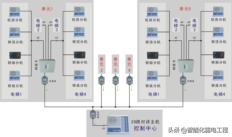 五方对讲设备由电梯厂家提供,本次设计针对19部电梯电梯桥厢内分机进行接入,弱电智能化施工方只提供电梯外至管理中心的线路敷设。