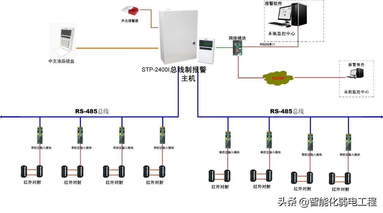其主要由报警中心:电脑1台(配中心接警软件)、总线报警主机1台,前端:三光束红外对射和单防区总线地址模块组成。