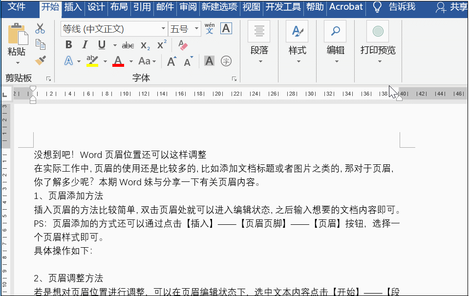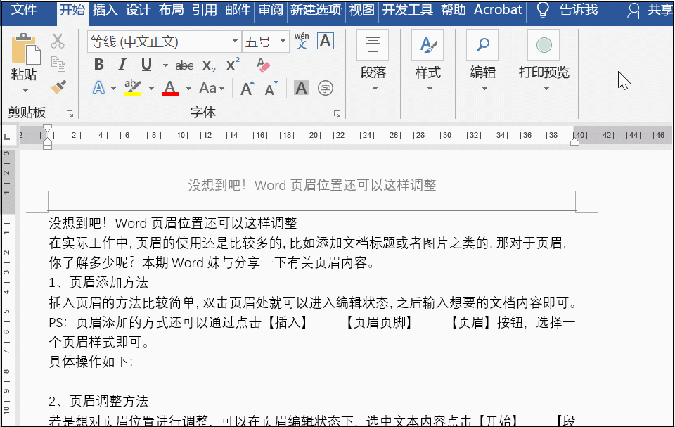 若想调整页眉对齐位置,可以在页眉编辑状态下,选中文本内容点击【开始】——【段落】,选择相应的对齐方式即可。