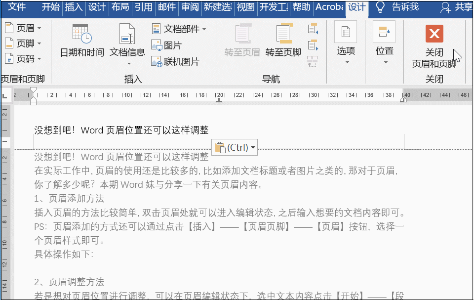若是觉得页眉高度不够,则可以通过调整位置来实现。首先打开页眉页脚编辑状态,之后点击【设计】——【位置】,在“页眉顶端距离”设置你想要的高度即可。