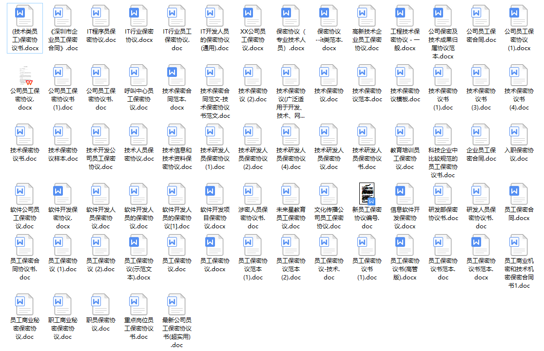 3.适合于各类企业的人力资源部门使用还有部分是企业高管和特殊岗位的保密协议(图2)图2还有75个技术人员保密协议(图3)图316个离职保密协议(图4)图418个商业保密协议(图5)图531个员工保密协议(图6)图6好了,今天就给大家分享到这里,我会持续分享各类办公用的各种好工具,欢迎持续关注!如果想免费获取这个模板,请关注、点赞、转发、留言吧,然后点击文章末尾的“了解更多“免费获取(图7)图7