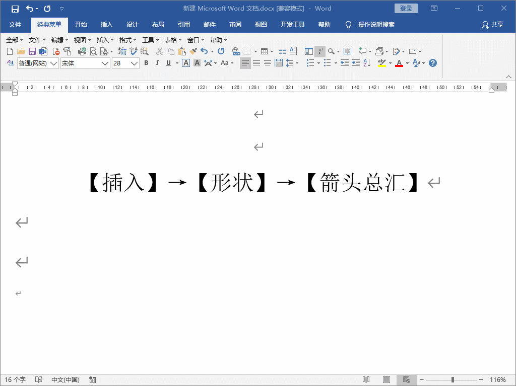 ② 依次点击【插入】→【形状】→【箭头总汇】,然后找到“燕尾形”形状点击即可插图图形,将【形状轮廓】设为【无轮廓】。