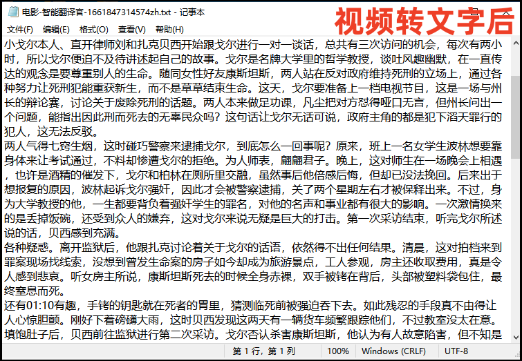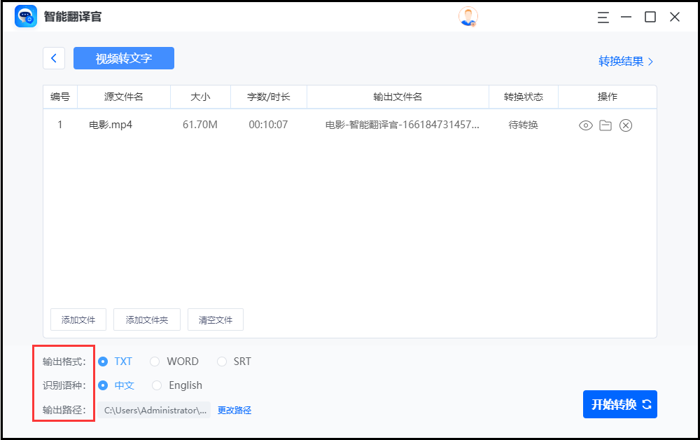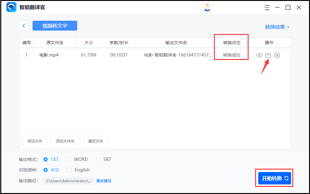 4.以上操作全部完成后,可以点击【开始转换】按钮。转换成功后,在视频列表中可以看到“转换成功”字样,转换后的文字文件会自动保存在【输出路径】选择的位置。