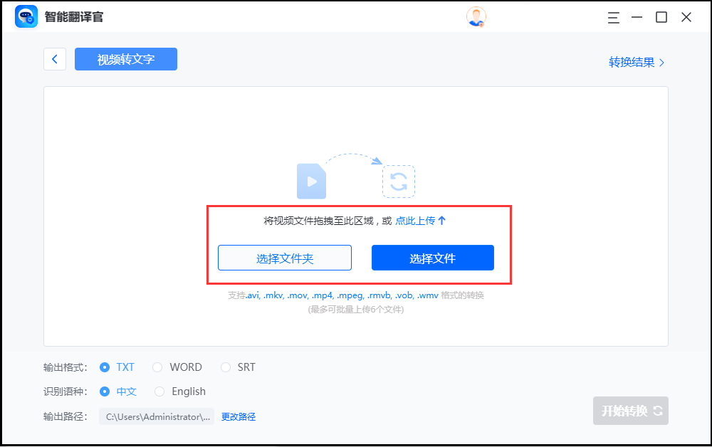 3.视频文件导入工具后,在页面下部选择文本的【输出格式】。只需要文本就选择TXT,如果需要转换为书面文件则选择WORD,作为字幕文件就选择SRT。然后,根据视频内容,选择【识别语种】。文字的保存位置在【输出路径】中选择,点击“更改路径”的字样,然后在窗口中选择合适的保存位置。