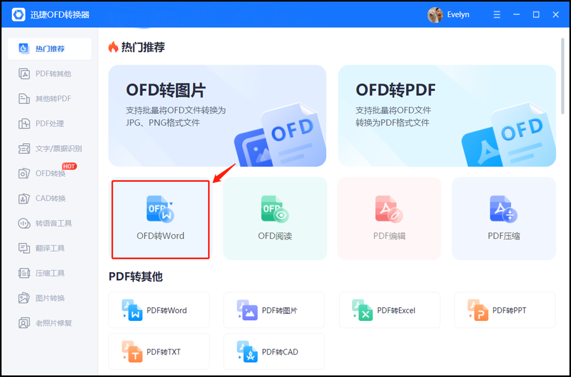第一步:首先我们直接打开我们的工具进入到我们的首页当中,在进入了之后,我们就能看到ofd转换成word的功能按钮了,我们直接的去点击进入。
