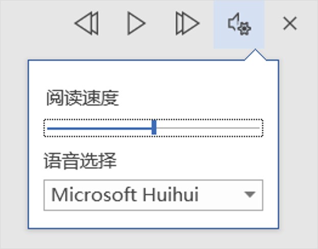 开启「语音朗读」后,在画面右上角会出现一工具栏。你可以点「播放」由鼠标所在位置的文字内容开始朗读;可以点「上/下一个」来跳转上下一行朗读;也可以开启「设置」调整阅读速度或选择不同声音的语音。