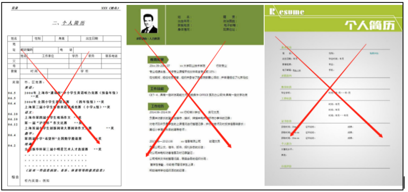什么样的简历模板不能用呢?不突出最要信息的模板,表格模板,太过简单的模板,像以下这些就不建议使用: