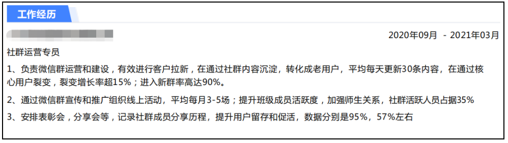 有经验的运营人到还好说,工作经历处直接把之前的工作内容写出来就行,但是针对刚转行运营岗位的新人或者初入职场的应届生呢?那他们的工作经历处该如何写呢?