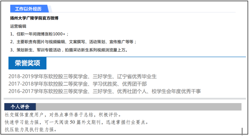 如果你学历感觉也不是很突出,那就放一些你自认为很突出的东西,比如:曾获得的奖项,做出过的数据等,那这些都可以表现出来,总之第二部分放置的内容就是你非常超群的内容