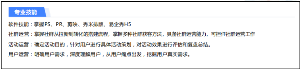 比如你在转行学习中,虽然准备面试新媒体运营,但同时也学到了很多其他知识,比如社群运营,活动运营,用户运营等,那这个环节就直接可以把自己的其他能力写上去,增加自己的竞争力,如下: