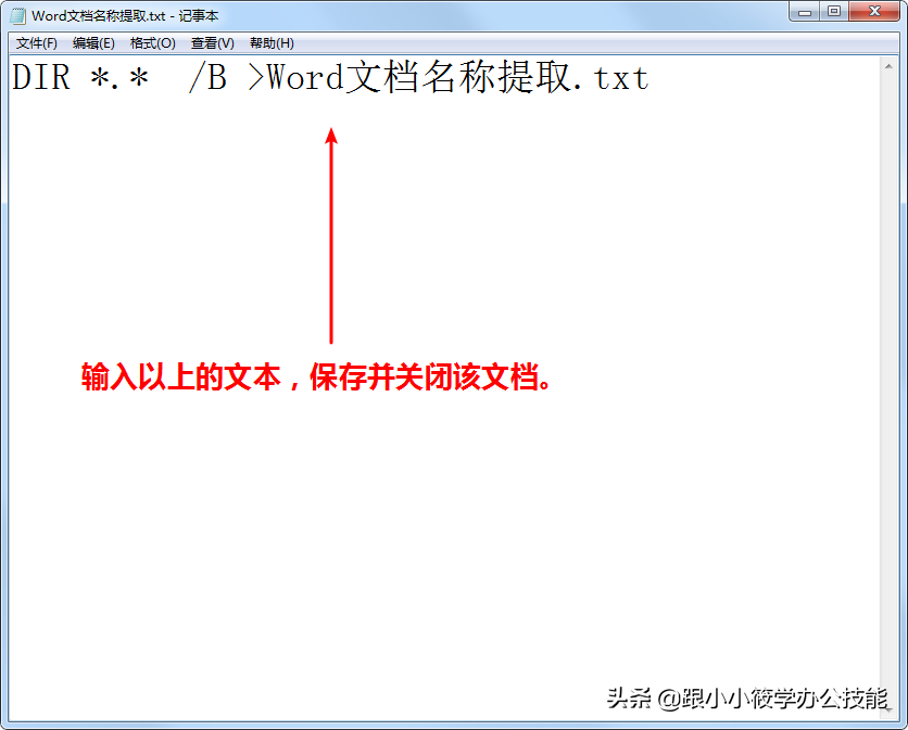2、打开“批量提取Word文档名称.txt”文本文档 -- 在文档中输入“DIR *.* /B >Word文档名称提取.txt”-- 保存并关闭该文本文档。