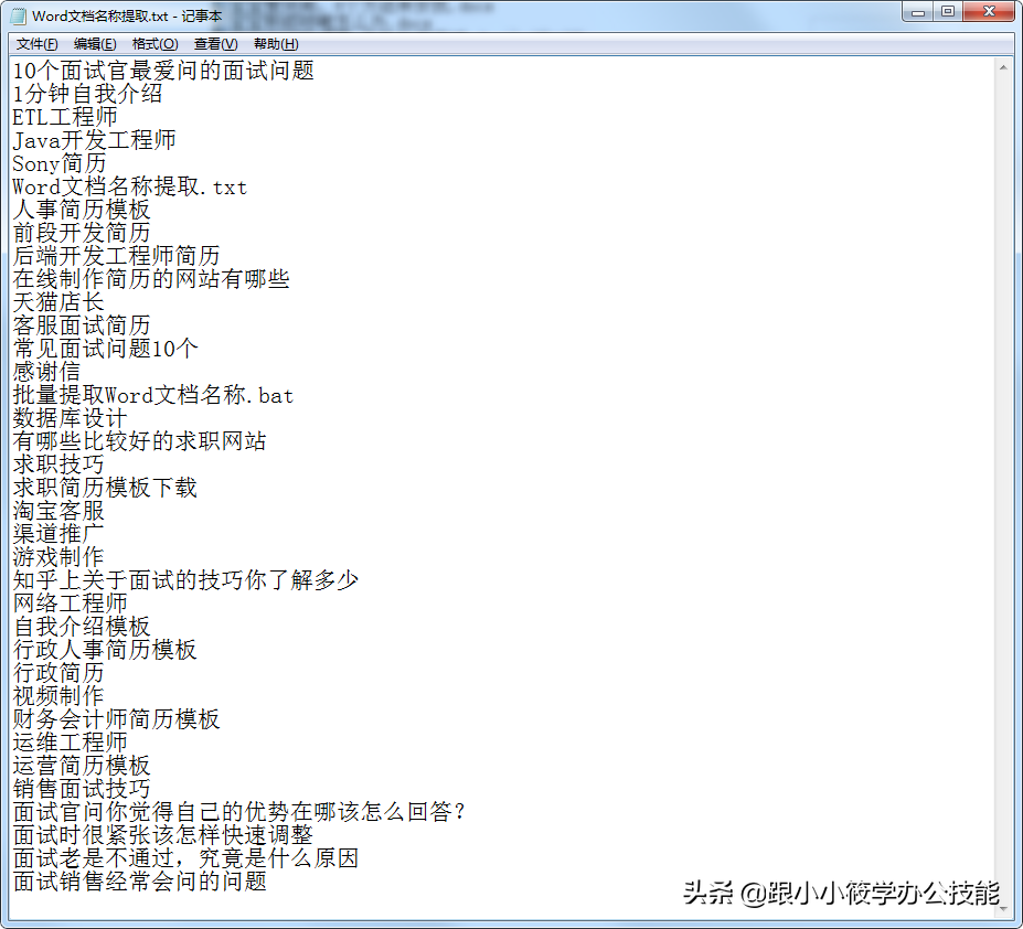5、打开“Word文档名称提取.txt”文本文件 -- 我们可以看到该文件夹下面的所有Word文档名称都在这里面了。