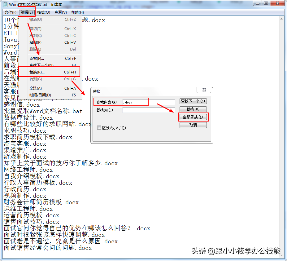 6、上图中生成的目录都带有Word文档的后缀,如果不想要的话我们可以用“替换”将这些后缀全部去掉。在文本文档中,点击“编辑”-- 点击“替换”或者按快捷键“Ctrl+H”打开“替换”对话框 -- 在“查找内容”中输入“.docx”--“替换为”为空 -- 点击“全部替换”按钮。