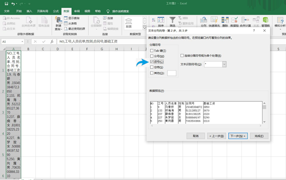 因为我们这里的word文档中是逗号分隔的,所以分隔符号选择「逗号」,其它符号以此类推。然后依次「下一步」、「完成」再调整一下单元格行列宽就可以转换成功。