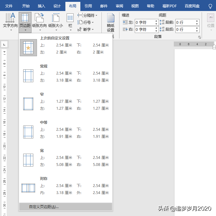 操作步骤:单击"布局"——在"页面设置"选项组中——单击"页边距"按钮——在弹出的下拉列表中选择"系统设定的页边距格式"或者"自定义页边距"——本例中选择"自定义页边距",如图。