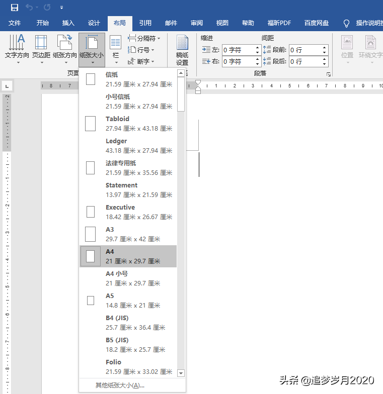 操作步骤:单击"布局"——在"页面设置"选项组中——单击"纸张大小"按钮——在弹出的下拉列表中选择"A4"即可,如图。