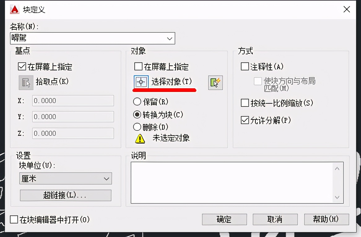 13、填充完成后再把图形转换成块,输入命令:BLOCK,弹出块定义,定义块的名称(防止粘贴到其他文件时变成其他图形),选择对象,进入选择状态后,自动返回块定义,最后在确定。