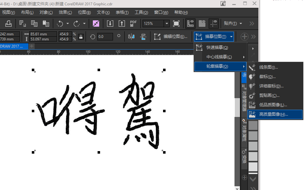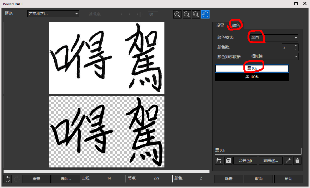 8、接下来先点一下要编辑图片,激活出描摹位图按钮,然后又进去调整,颜色黑白黑0%,然后确定。