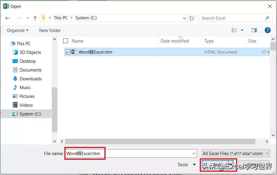 2. 现在打开一个空的 Excel 文件 --> 按 Ctrl+O --> 在弹出的对话框中选择刚才保存的网页文件 --> 点击“打开”