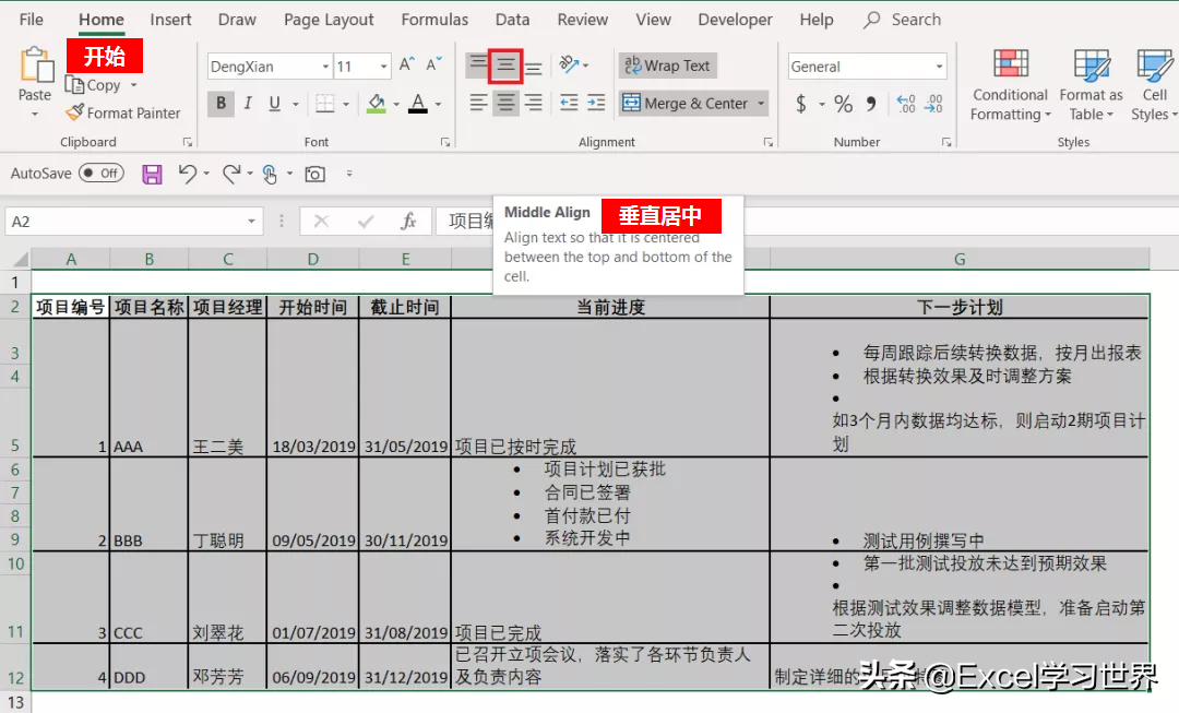 3. 最后再适当优化一下格式:选中表格区域 --> 选择菜单栏的“开始”-->“垂直居中”