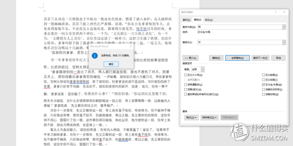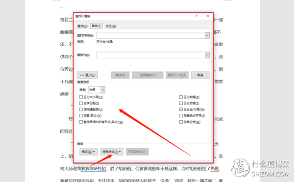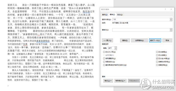 ⑨最烦人就是遇到一篇文章里有很多空格,如果手动一个个删除又很麻烦。这时候我们全选文章,利用“查找替换”,弹出对话框后,在查找内容对话框中输入^32,替换为对话框不用输入任何内容。记得不勾选“使用通配符”,而是勾选“区分全半角”。最后点击全部替换即可,得到最好那张图的效果。
