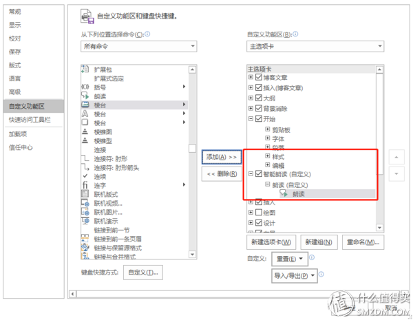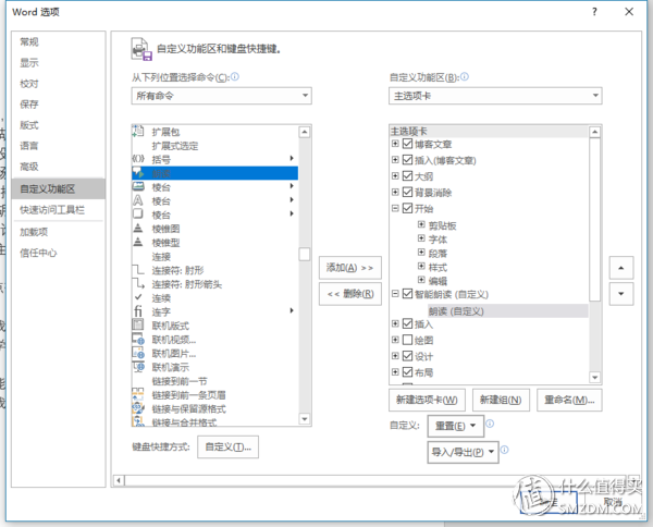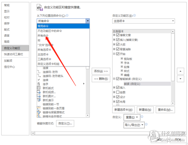 这时候把视线移到左方,在“从下面位置选择命令”处,点击后面的倒三角形,然后点击“所有命令”。往下面拖动滑条,找到“朗读”这个功能,然后点击“添加”添加到“组”。