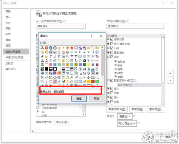 弹出自动以功能区选项,在右下方处,点击“新建选项卡”。为了以后操作便利,最好给他起个名字,因此,新建了一个选项卡之后,用鼠标左键点击这个新建的选项卡,然后点击右键,在点击“重命名”。