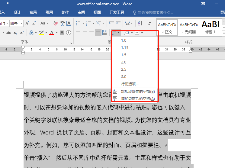 选中文本,点击开始——段落——缩进和间距——在间距中设置相应的大小即可。