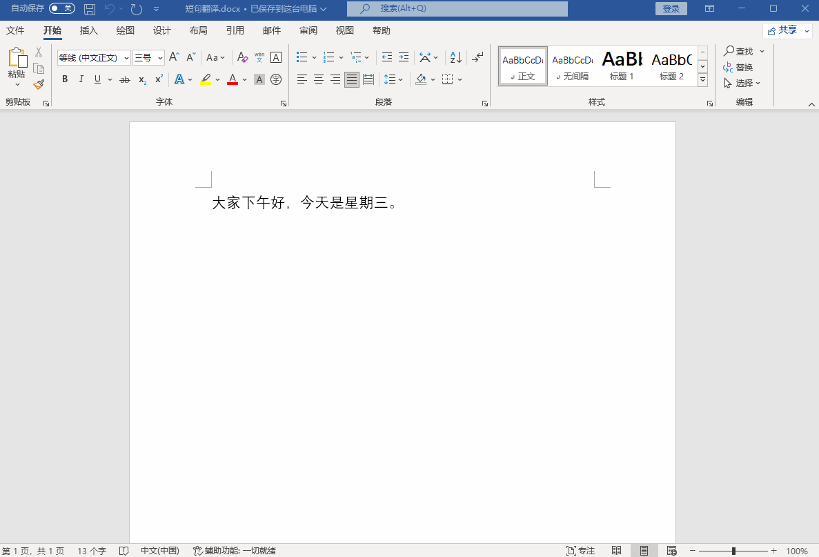 我们在Word里输入一段文字,然后选中文本,鼠标右击选择【翻译】,右侧会出现翻译工具,自动检测到源语言为中文,下方的目标语言自由选择。