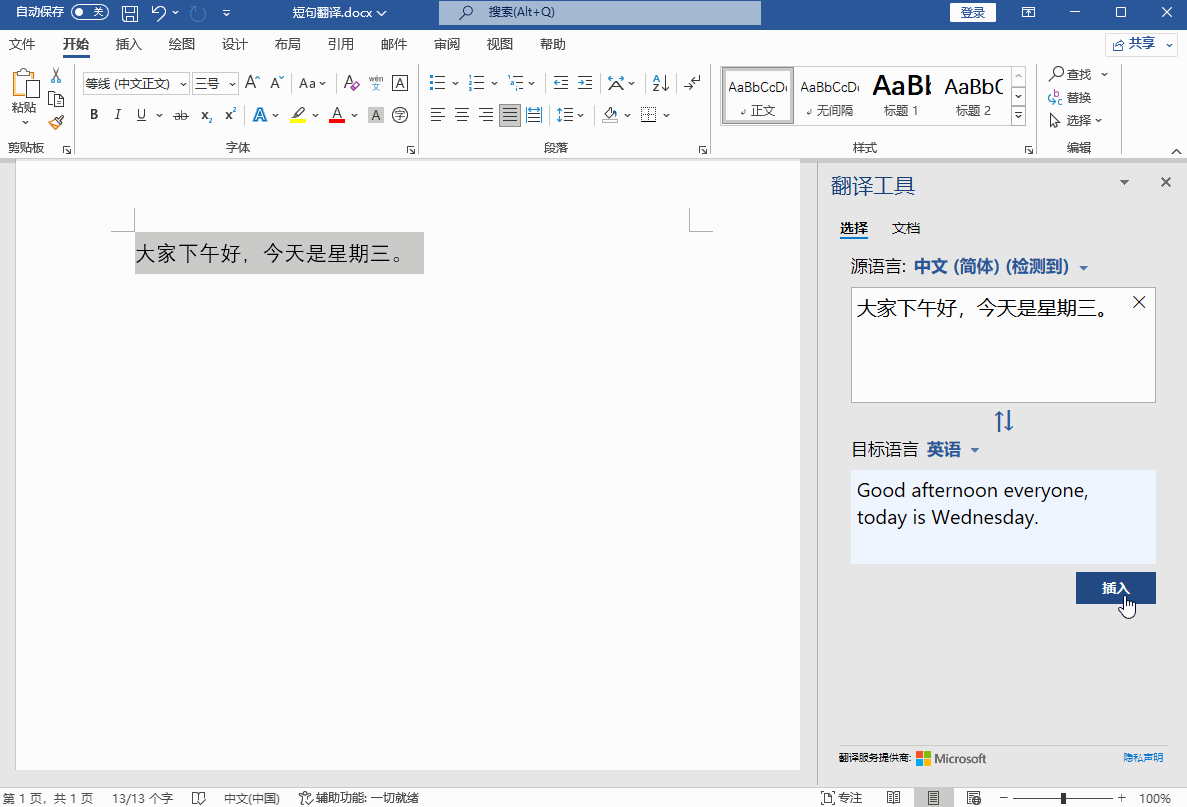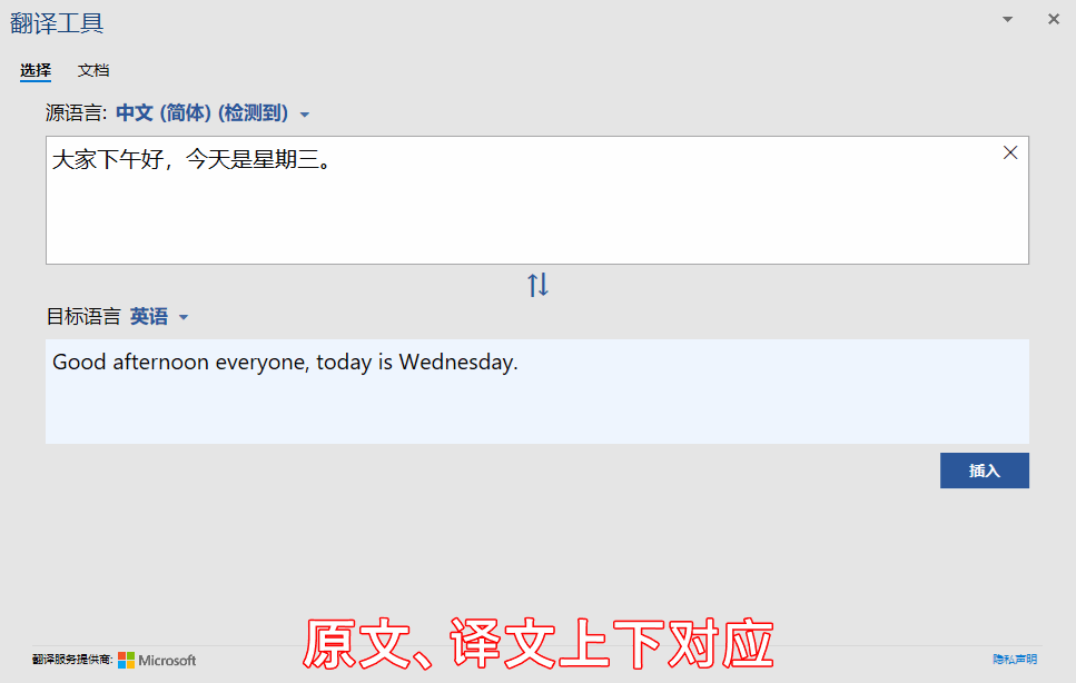 接下来点击【插入】按钮,文本就会被替换成译文。如果你想同时保留原文和译文,需要手动复制目标语言,关闭翻译工具,粘贴到原文下方即可。