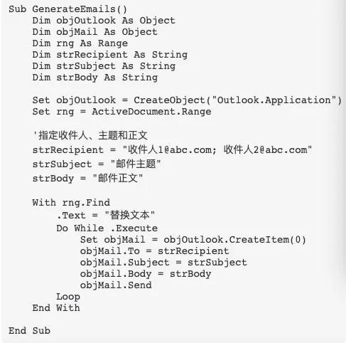 在这个宏中,我们使用了Outlook对象模型来创建邮件,并使用Find对象查找指定的替换文本进行批量替换