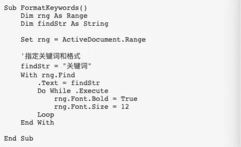 在这个宏中,我们使用了Range对象和Find对象来查找文档中的关键词,并将其格式化为粗体字和12号字体。可以根据需要自定义关键词和格式。