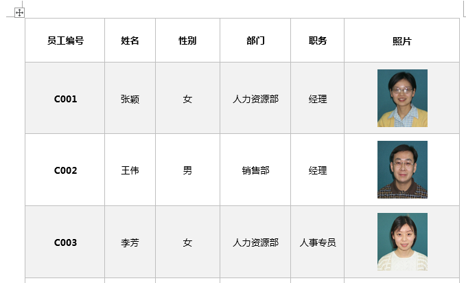 他需要在Word的一个连续的表格中,将几百个人按照名字自动导入照片,并能像下图这样将原来大小不一的照片都统一成相同的大小。小A的数据原来是直接存储在Word中的,除了没有照片之外,其他数据都是已经填好了的。