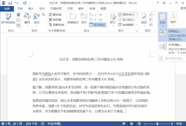 第一步:首先我们先打开原版Word文档内容。然后依次点开菜单栏:审阅—比较。如下图所示: