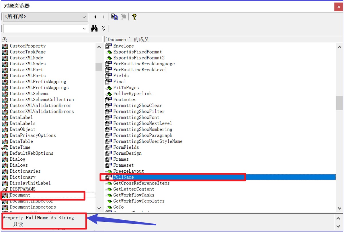每个对象的每个属性都有可读写的特点,包括:只能读取属性(只读)或者是只能编写属性(只写)。当选定属性时,Visual Basic 编辑器中的对象浏览器会在浏览器窗口底部显示读/写状态。如下截图: