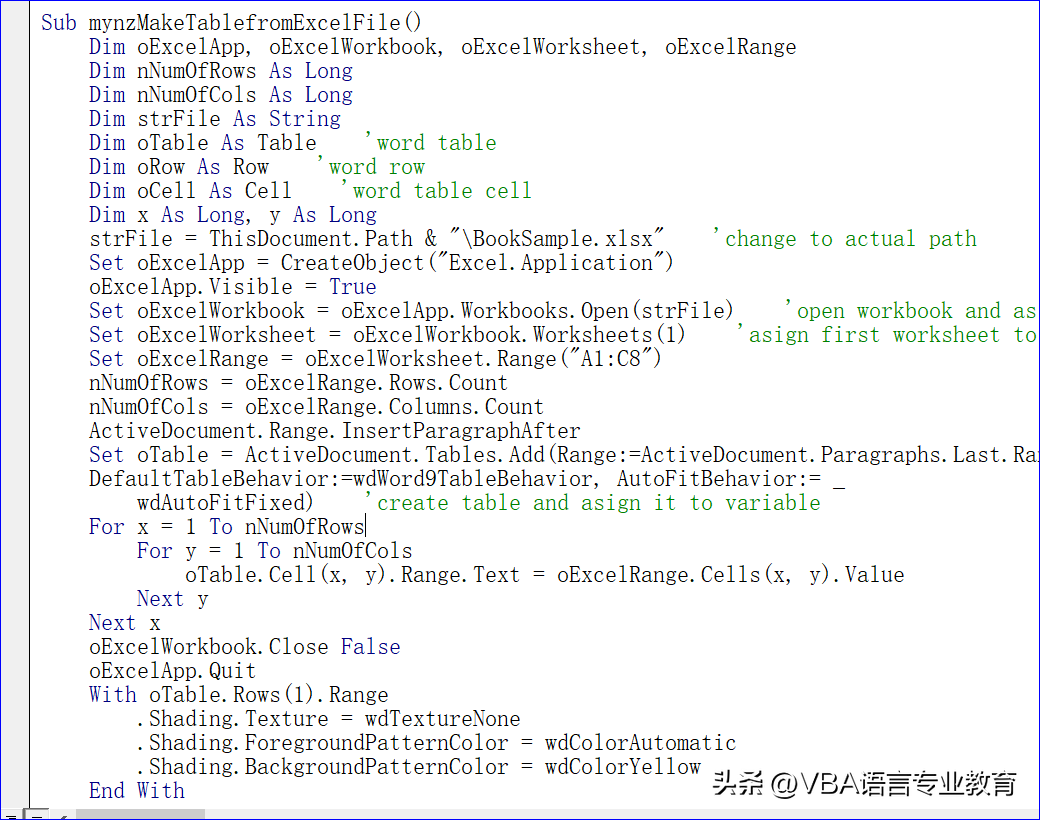 VBA是面向对象编程的语言,博大精深。很多朋友咨询英语和VBA的关系,这套《VBA即用型代码手册(汉英)》集合了众多的案例,案例我用汉语和英语同时发布,学员从中可以更好的领会和掌握VBA中用到的一些英语。今日的内容:VBA代码手册:从Excel文件创建Word表