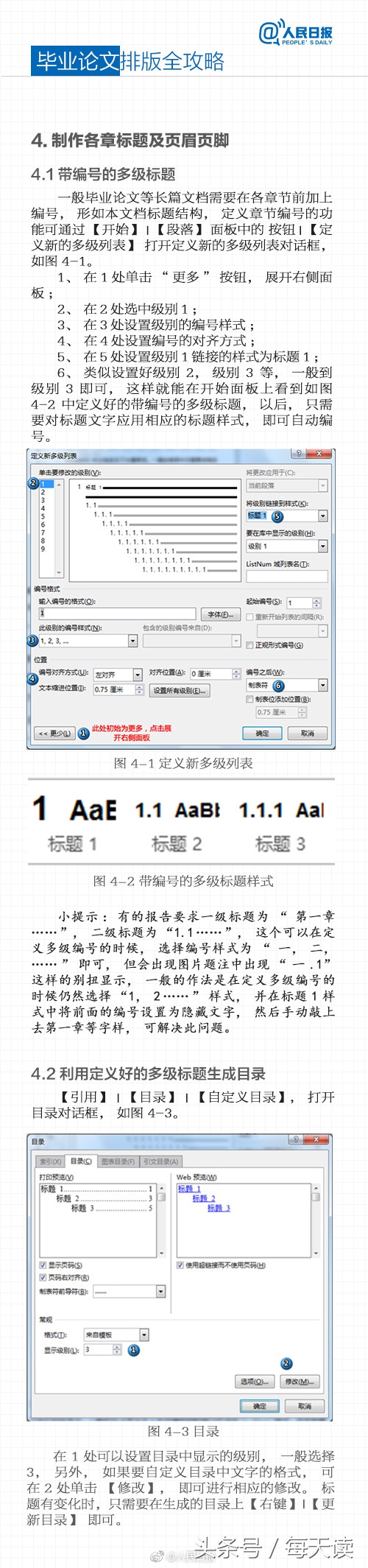 设置完样式之后,我们要来看看各级标题了。一般本科毕业论文至少要用到3级标题。难度大一些的话会用到4级甚至五级标题。标题样式不但影响论文内容,也同样影响目录的格式,必须认真对待。