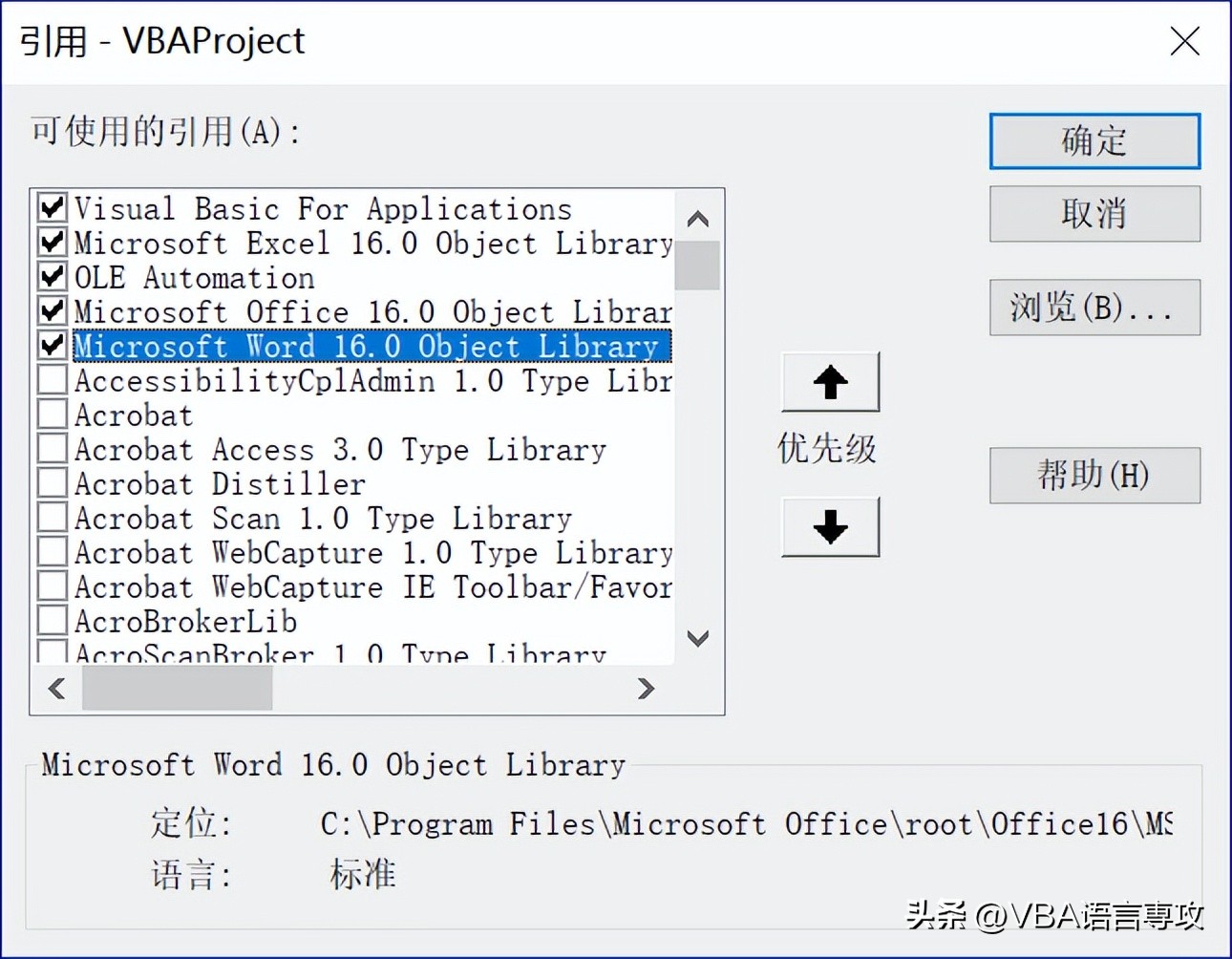 我们将通过VBA代码自动化整个过程。使用宏代码,word应用程序将自动启动,VBA代码将使用粘贴命令将数据插入doc文件。有一个重要的步骤,你不能错过,单击“工具”,选择“引用”,向下滚动,直到找到“Microsoft Word 16.0 Object Library”,确保选中该框;参考下图: