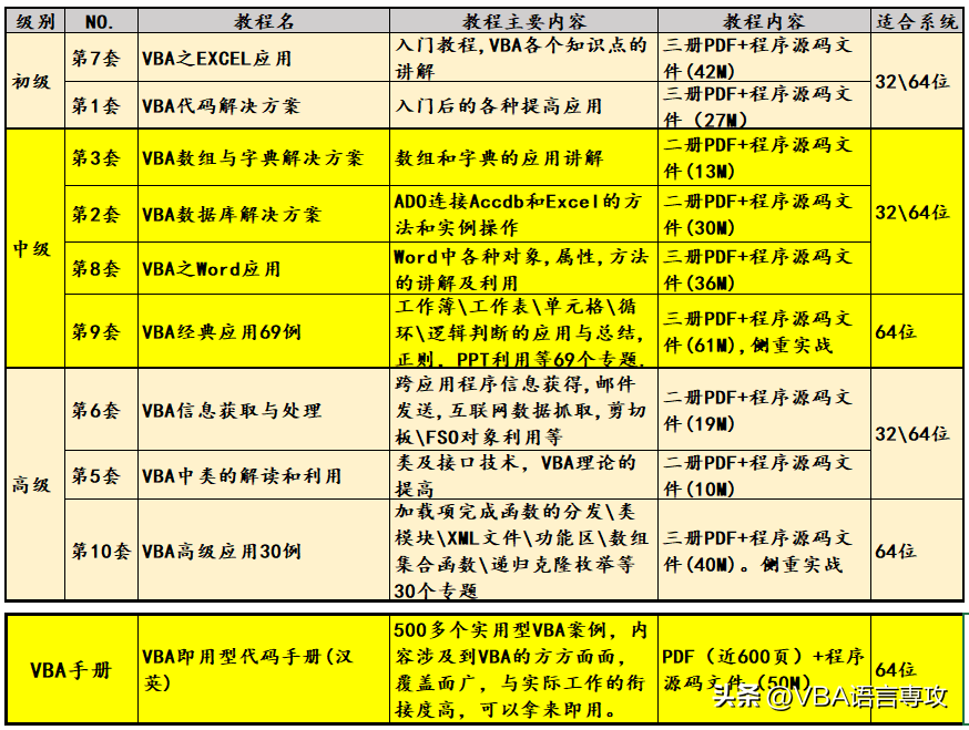 我给VBA的定义:VBA是个人小型自动化处理的有效工具。利用好了,可以大大提高自己的工作效率,而且可以提高数据的准确度。我的教程一共九套,分为初级、中级、高级三大部分。是对VBA的系统讲解,从简单的入门,到数据库,到字典,到高级的网抓及类的应用。另外,为了方便大家学习和应用,我又推出了一部VBA汉英手册,这部手册覆盖了VBA的方方面面,与实际工作衔接度高。