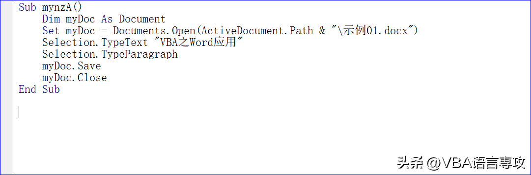 Set myDoc = Documents.Open(ActiveDocument.Path & "示例01.docx")