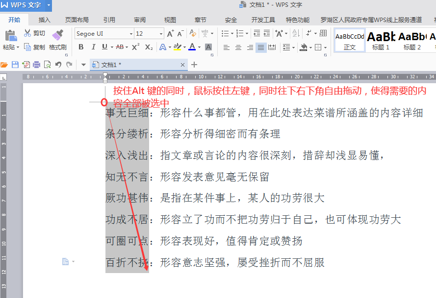 2.按住键盘上的“Alt” 按键不放手,同时鼠标按住左键,往右下角自由拖动,这样就可以选出自己需要的内容(灰色标记)。选好后松开“Alt” 按键和鼠标。