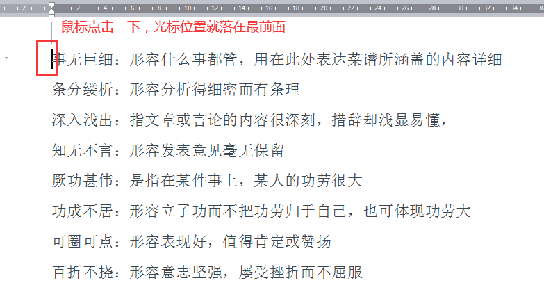 1.在需要选中四个字的最前或最后位置点击一下,将光标放在最前或最后,如下图