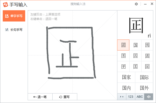 2、在弹出的[手写输入]界面中,用鼠标在中间的田字格中手动划出生僻字"囸"字的笔划,搜狗输入法会根据我们手动输入的笔划进行识别,在右侧上方显示出对应的汉字及拼音。鼠标单击红色方框框选的汉字"囸",即可在文档中输入该汉字。根据实际需要,可对生僻字字体大小、位置进行相应调整。