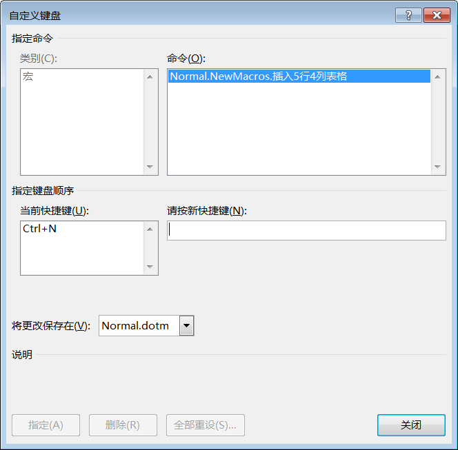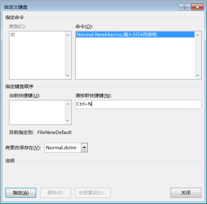 第3步:打开【自定义键盘】对话框,将光标定位在【请按新快捷键】文本框中,按下〈Ctrl〉+〈N〉组合键,这样以后按下该快捷键即可运行此宏,如下图所示。