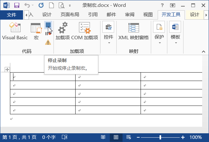 第7步:录制完成后,切换到【开发工具】选项卡;在【代码】组中单击【停止录制】按钮,如下图所示。